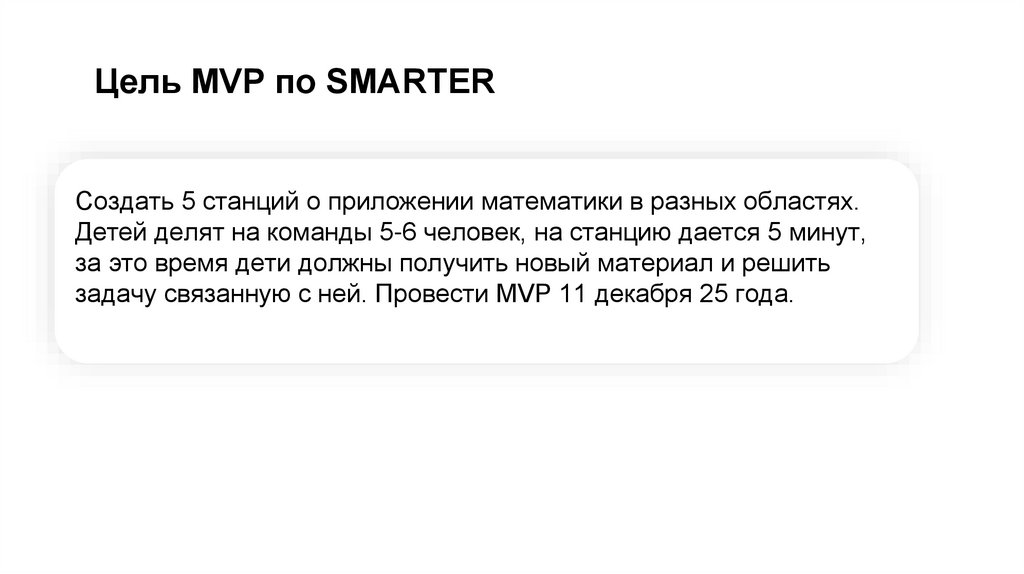 Цель MVP по SMARTERСоздать 5 станций о приложении математики в разных областях.