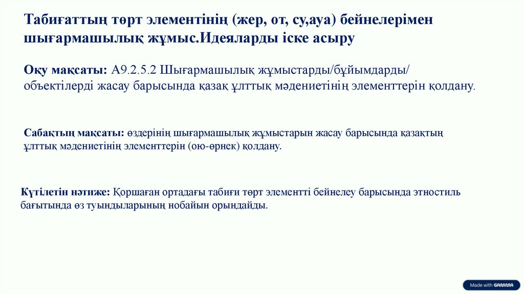 Табиғаттың төрт элементінің (жер, от, су,ауа) бейнелеріменшығармашылық жұмыс.Идеяларды іске асыру