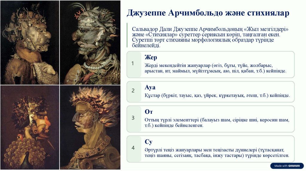 Джузеппе Арчимбольдо және стихияларСальвадор Дали Джузеппе Арчимбольдоның «Жыл мезгілдері»