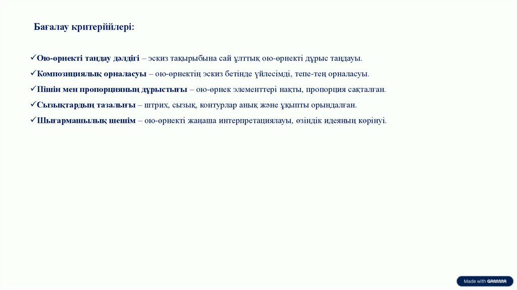 Бағалау критерййлері:Ою-өрнекті таңдау дәлдігі – эскиз тақырыбына сай ұлттық ою-өрнекті дұрыс таңдауы.