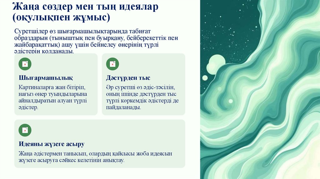 отырып, табиғи стихиялардың бейнелерін белгілі бір техникада