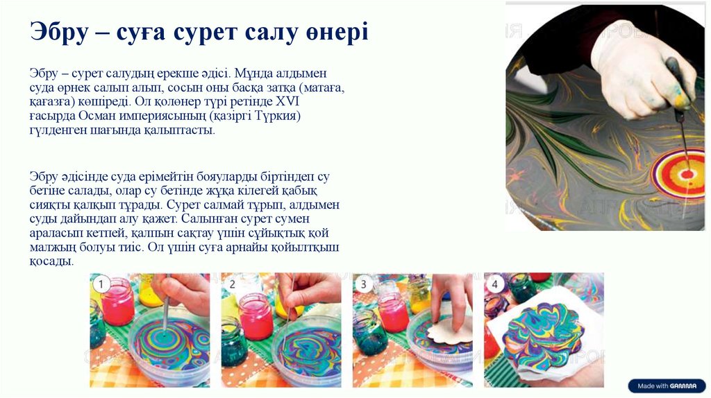 Эбру – суға сурет салу өнеріЭбру – сурет салудың ерекше әдісі. Мұнда алдымен