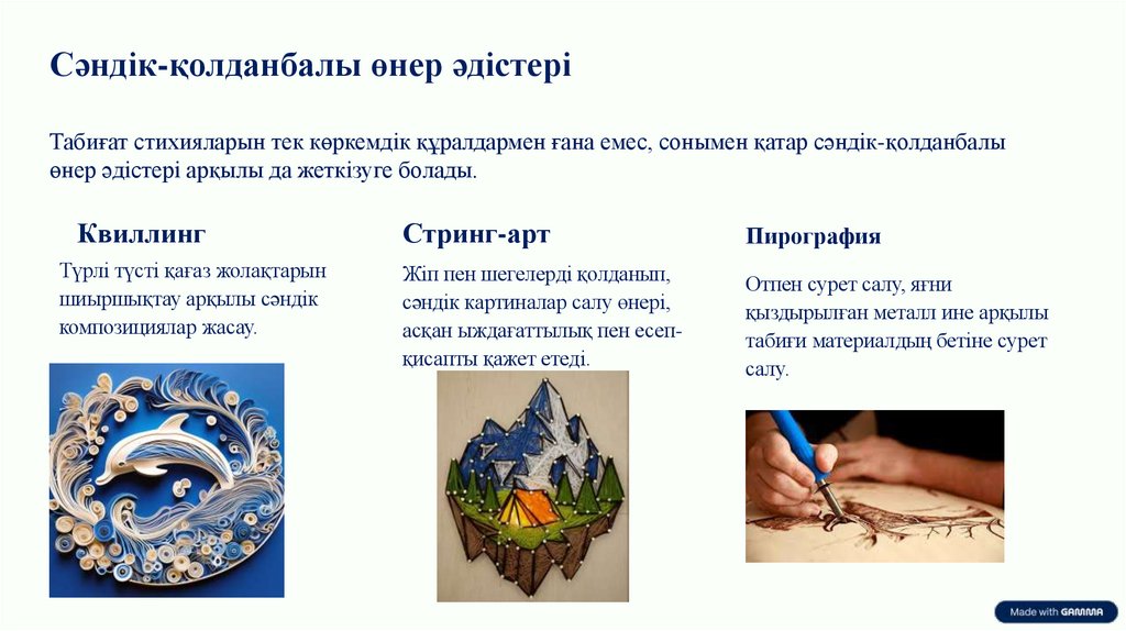 Сәндік-қолданбалы өнер әдістеріТабиғат стихияларын тек көркемдік құралдармен ғана емес, сонымен қатар сәндік-қолданбалы