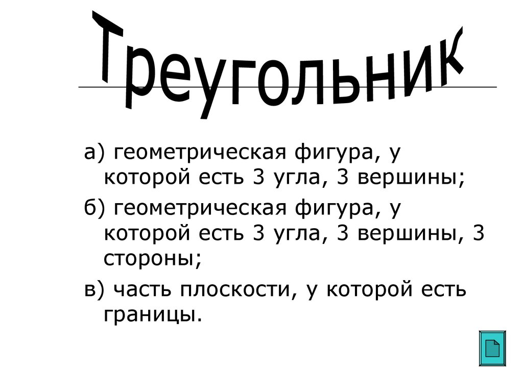 а) геометрическая фигура, укоторой есть 3 угла, 3 вершины;