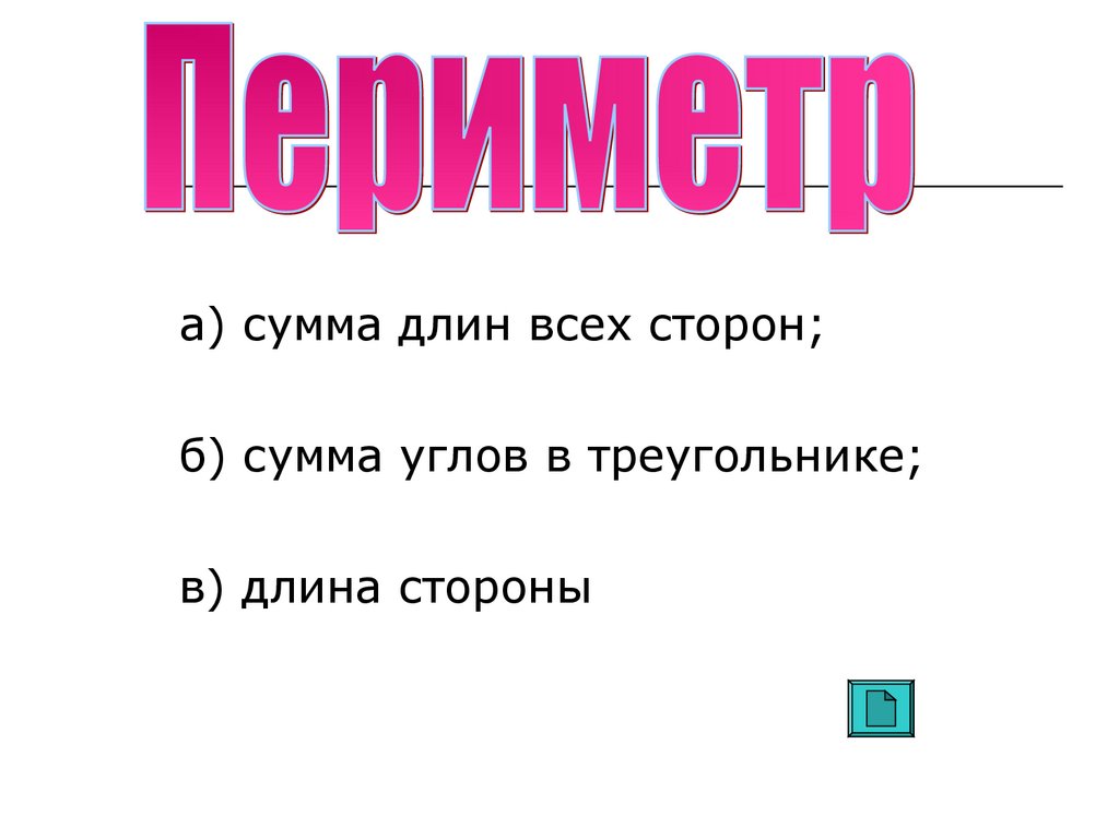 а) сумма длин всех сторон;б) сумма углов в треугольнике;