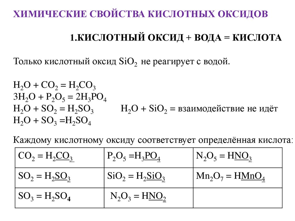 ХИМИЧЕСКИЕ СВОЙСТВА КИСЛОТНЫХ ОКСИДОВ1.КИСЛОТНЫЙ ОКСИД + ВОДА = КИСЛОТА