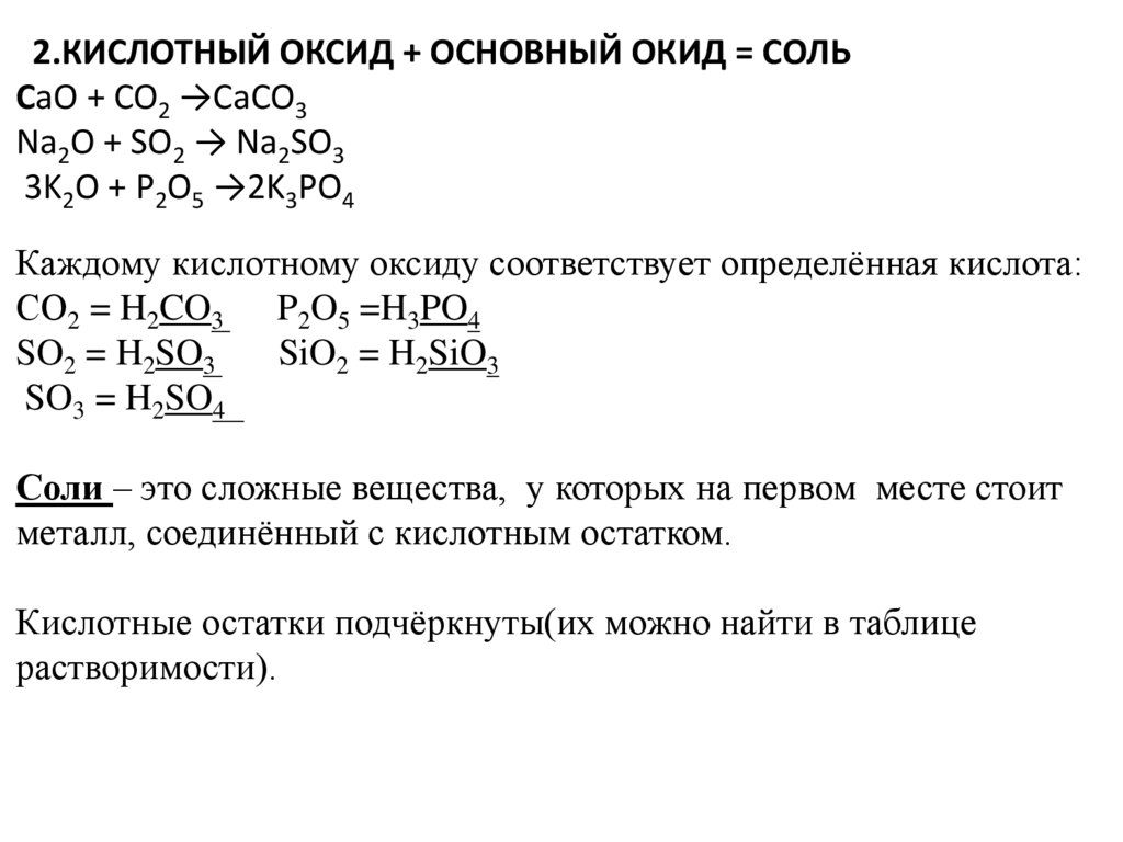 2.КИСЛОТНЫЙ ОКСИД + ОСНОВНЫЙ ОКИД = СОЛЬСaO + CO2 →CaCO3