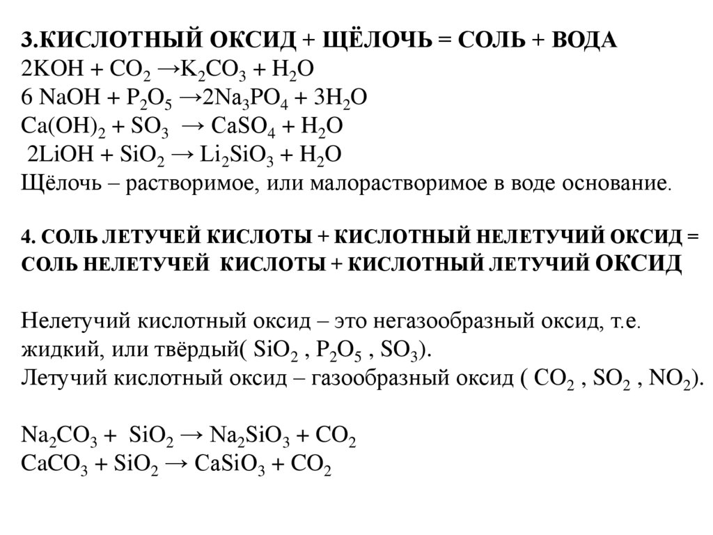 3.КИСЛОТНЫЙ ОКСИД + ЩЁЛОЧЬ = СОЛЬ + ВОДА2KOH + CO2 →K2CO3 + H2O