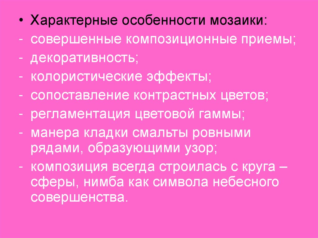 • Характерные особенности мозаики:- совершенные композиционные приемы;