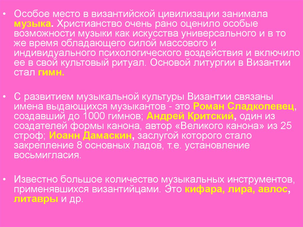 • Особое место в византийской цивилизации занималамузыка. Христианство очень рано оценило особые