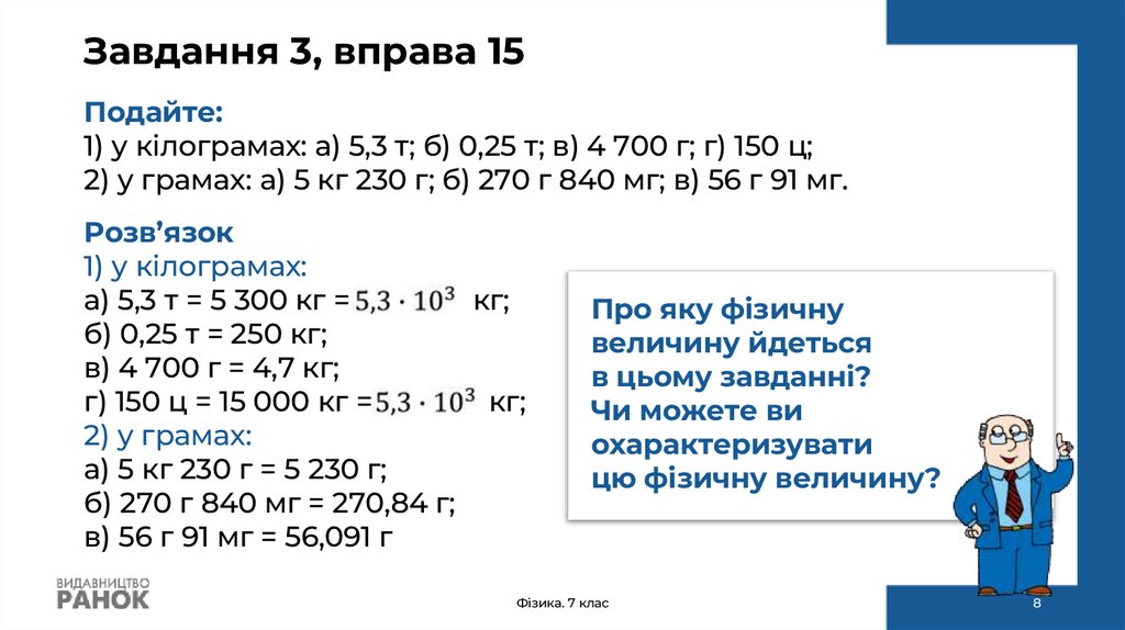 1) у кілограмах: а) 5,3 т; б) 0,25 т; в) 4 700 г; г) 150 ц;