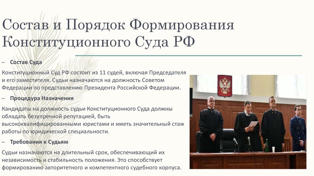 – Состав СудаКонституционный Суд РФ состоит из 11 судей, включая Председателя