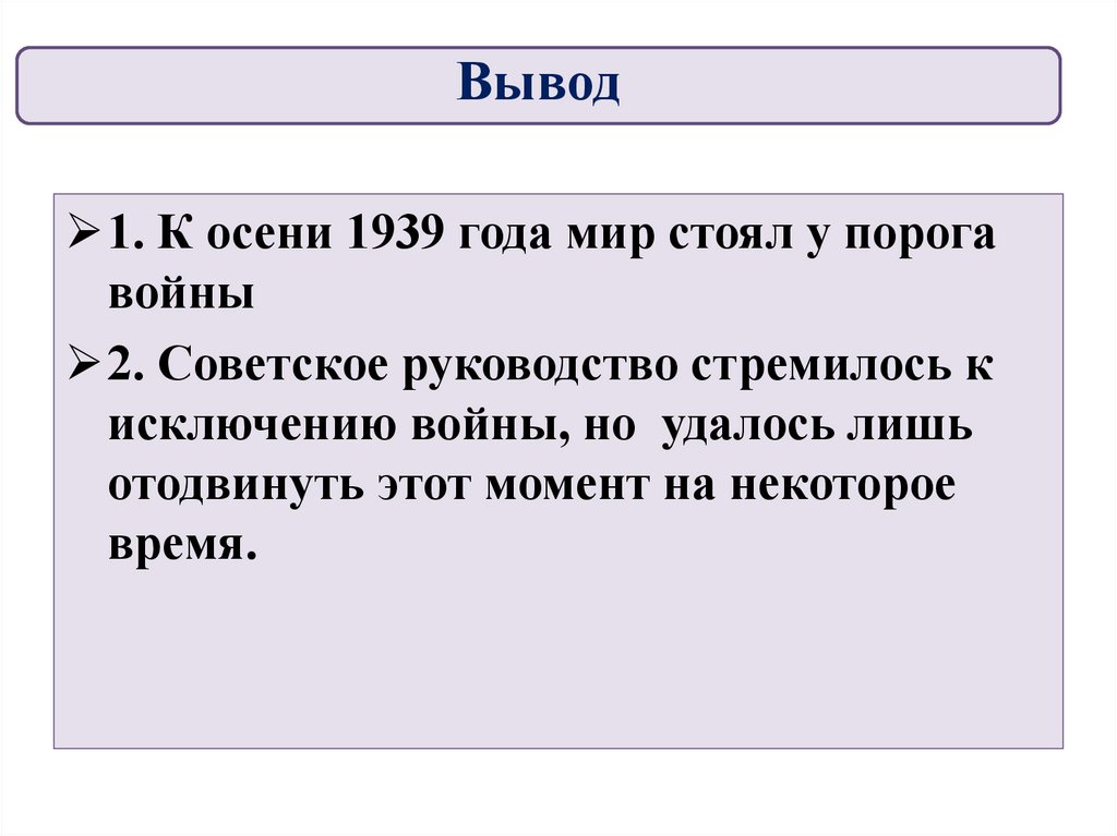 Вывод1. К осени 1939 года мир стоял у порога