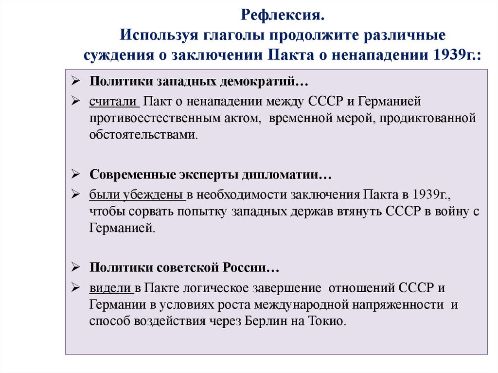 100. Рефлексия. Используя глаголы продолжите различные суждения о заключении Пакта о ненападении 1939г.: