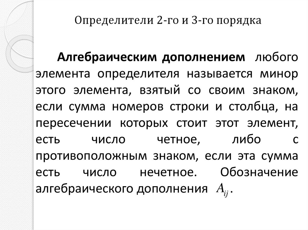 Алгебраическим дополнением любогоэлемента определителя называется минор