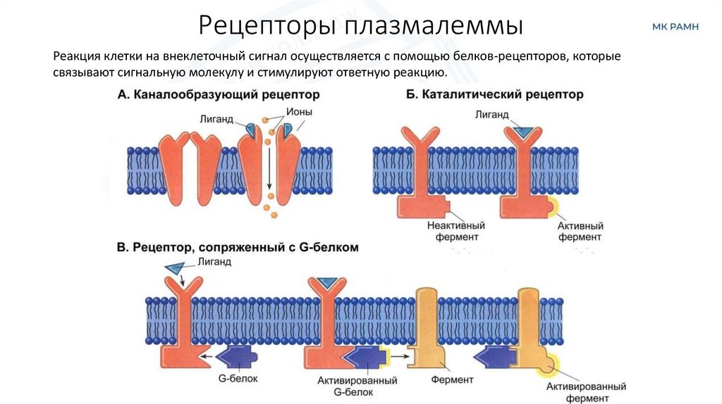 Реакция клетки на внеклеточный сигнал осуществляется с помощью белков-рецепторов, которыесвязывают сигнальную молекулу и стимулируют ответную реакцию.
