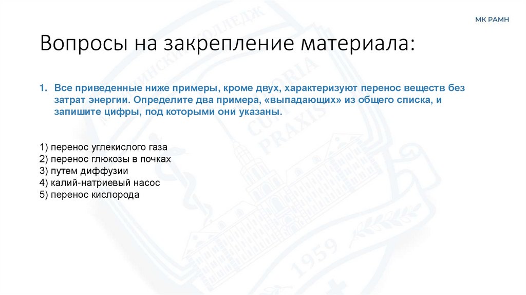 1. Все приведенные ниже примеры, кроме двух, характеризуют перенос веществ беззатрат энергии. Определите два примера, «выпадающих» из общего списка, и