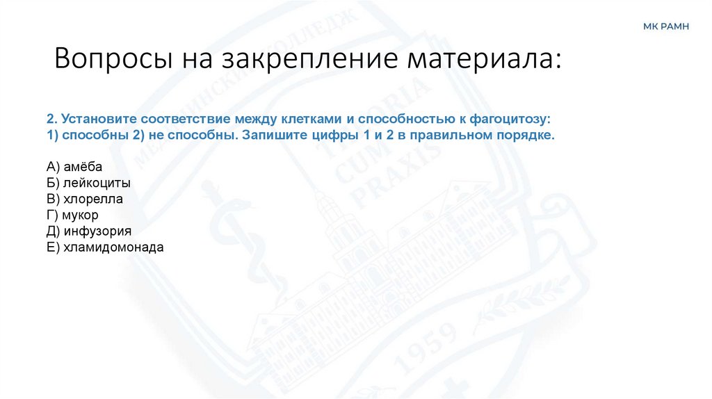 2. Установите соответствие между клетками и способностью к фагоцитозу:1) способны 2) не способны. Запишите цифры 1 и 2 в правильном порядке.
