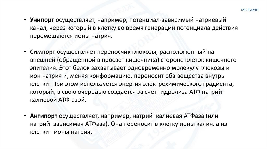 • Унипорт осуществляет, например, потенциал-зависимый натриевыйканал, через который в клетку во время генерации потенциала действия