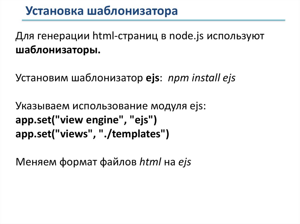 Установка шаблонизатораДля генерации html-страниц в node.js используют