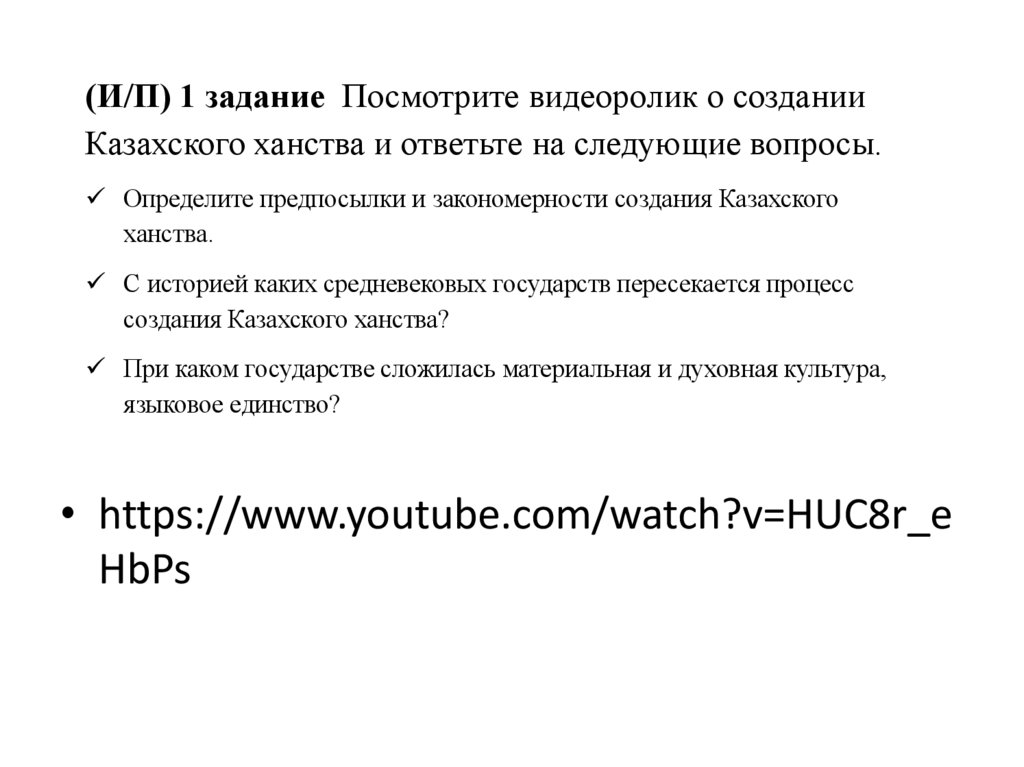 (И/П) 1 задание Посмотрите видеоролик о созданииКазахского ханства и ответьте на следующие вопросы.