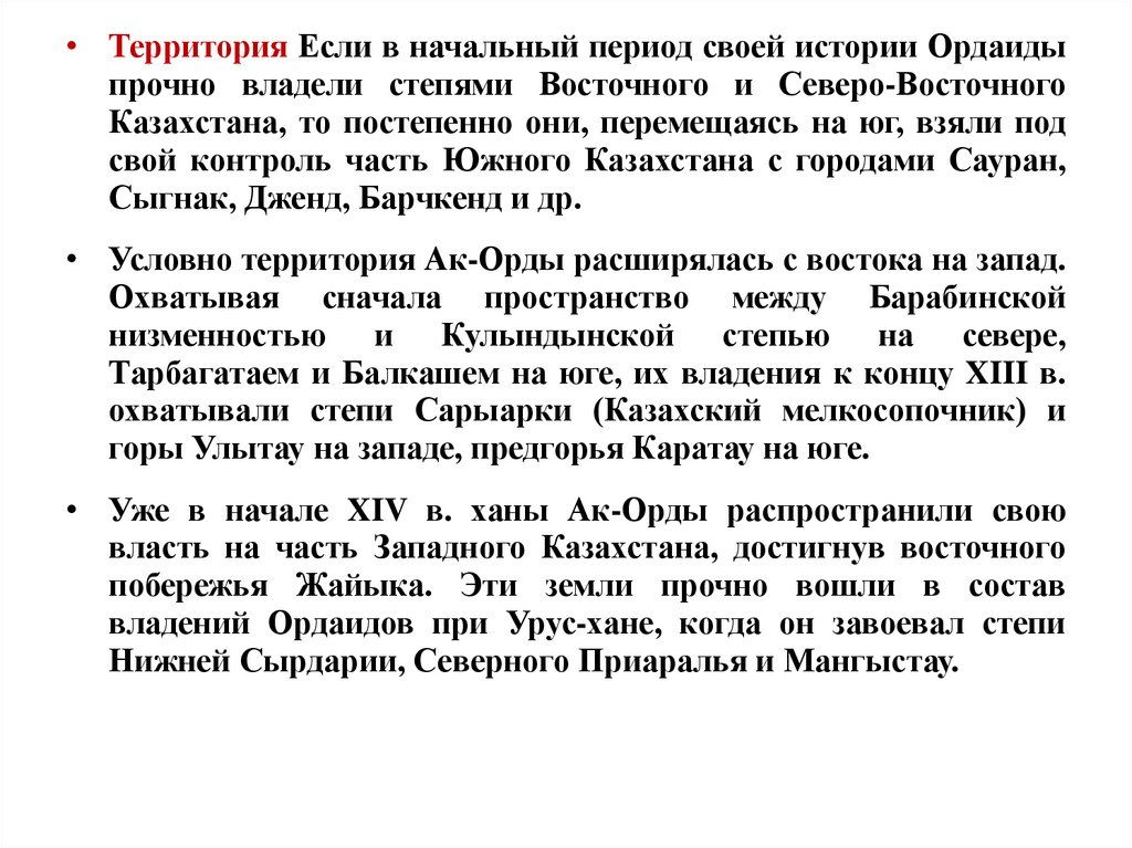 • Территория Если в начальный период своей истории Ордаидыпрочно владели степями Восточного и Северо-Восточного