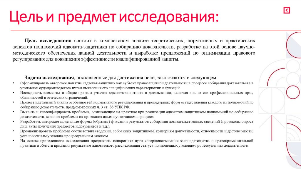 аспектов полномочий адвоката-защитника по собиранию доказательств, разработке на этой основе научнометодического обеспечения данной деятельности и выработке предложений по оптимизации правового