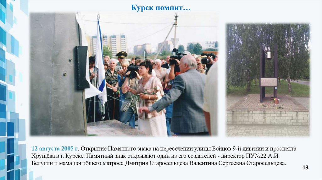 Курск помнит…12 августа 2005 г. Открытие Памятного знака на пересечении улицы Бойцов 9-й дивизии и проспекта