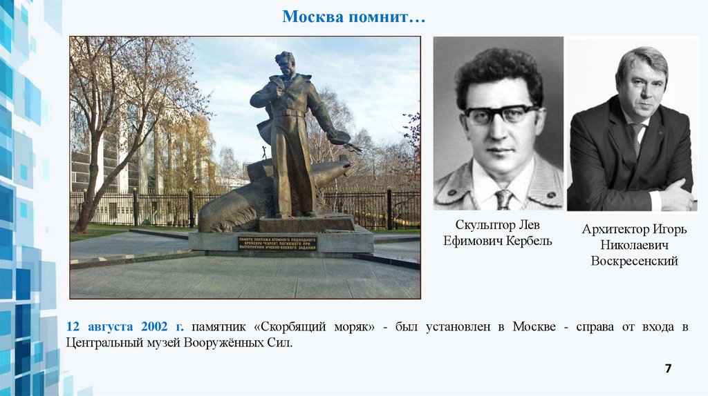12 августа 2002 г. памятник «Скорбящий моряк» - был установлен в Москве - справа от входа в