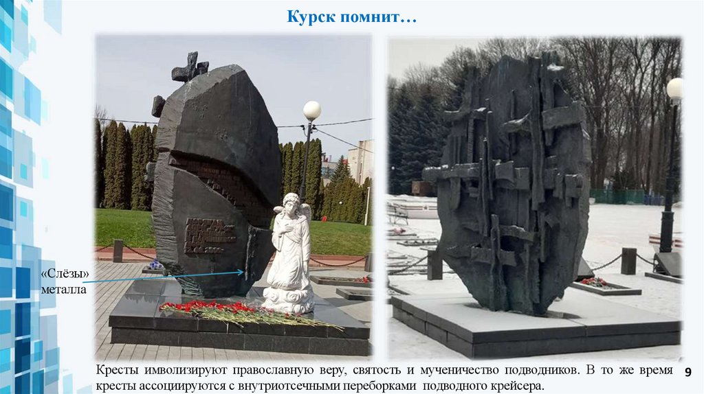 Кресты имволизируют православную веру, святость и мученичество подводников. В то же время 9