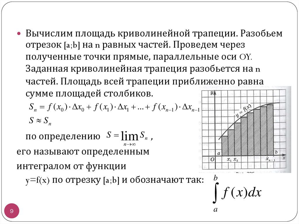 Вычислим площадь криволинейной трапеции. Разобьемотрезок [a;b] на n равных частей. Проведем через