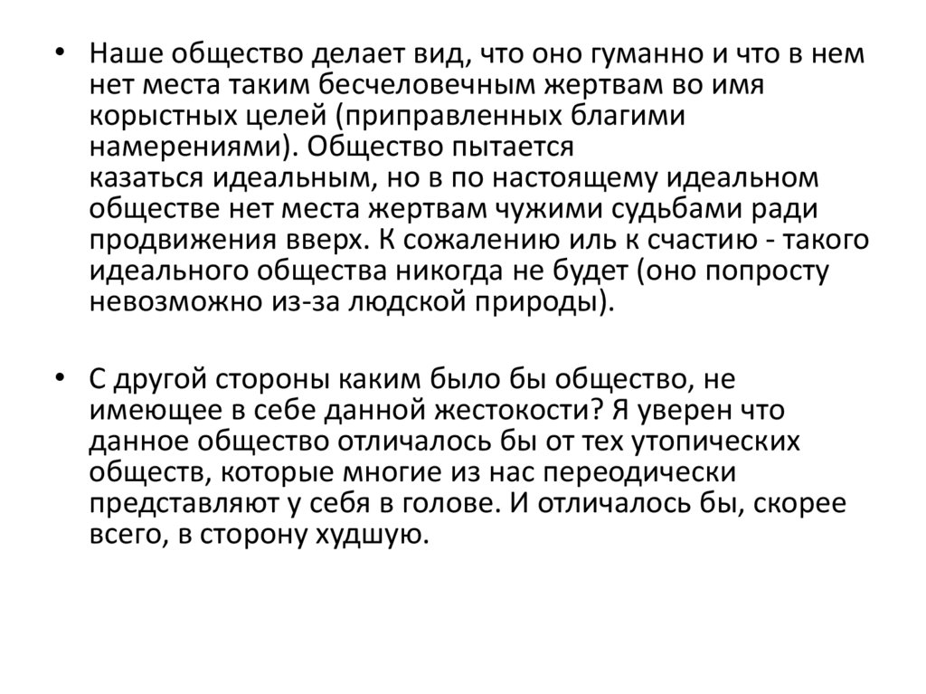 • Наше общество делает вид, что оно гуманно и что в немнет места таким бесчеловечным жертвам во имя
