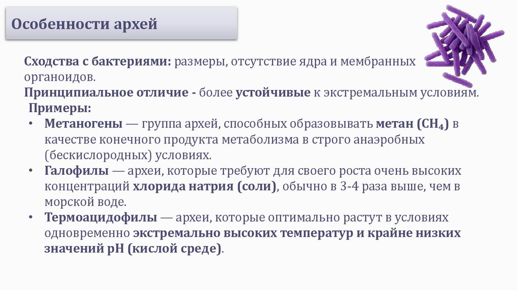 • Галофилы — археи, которые требуют для своего роста очень высоких