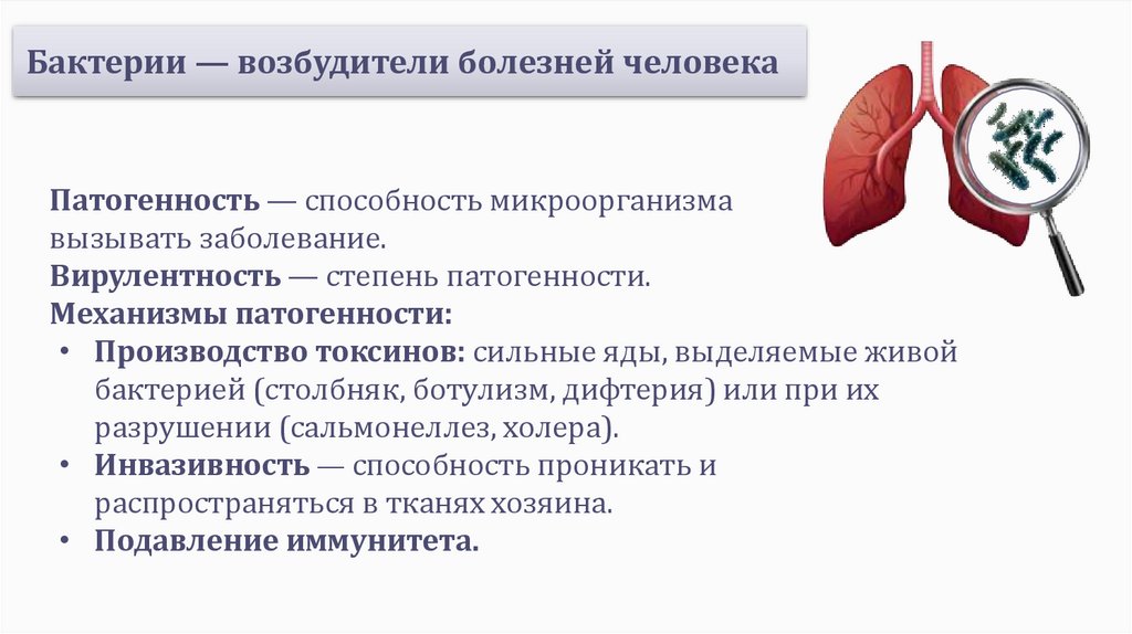 Бактерии — возбудители болезней человекаПатогенность — способность микроорганизма