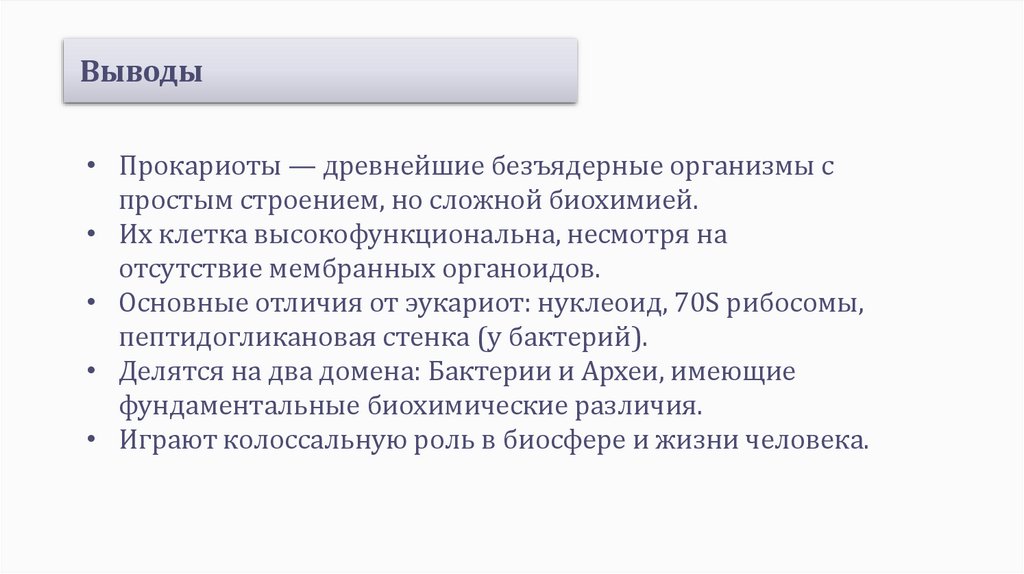 Выводы• Прокариоты — древнейшие безъядерные организмы с