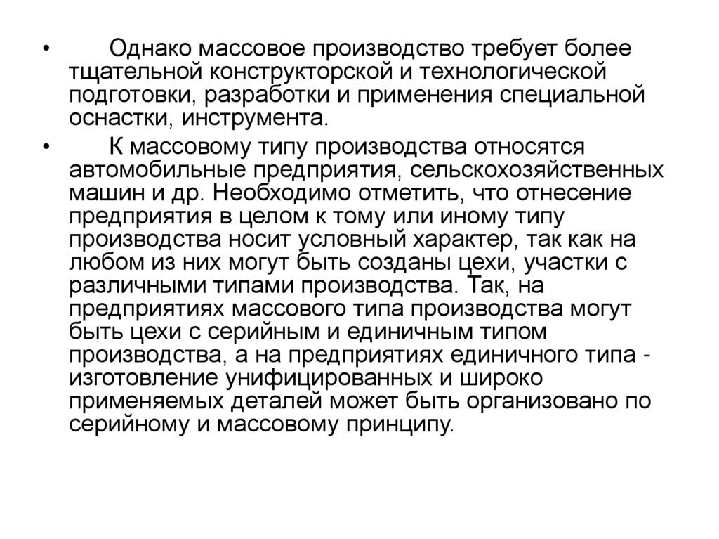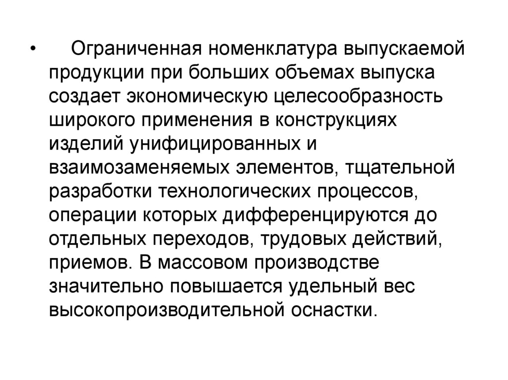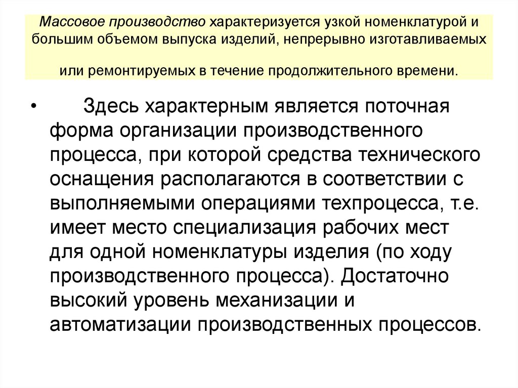 Массовое производство характеризуется узкой номенклатурой ибольшим объемом выпуска изделий, непрерывно изготавливаемых