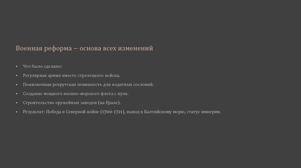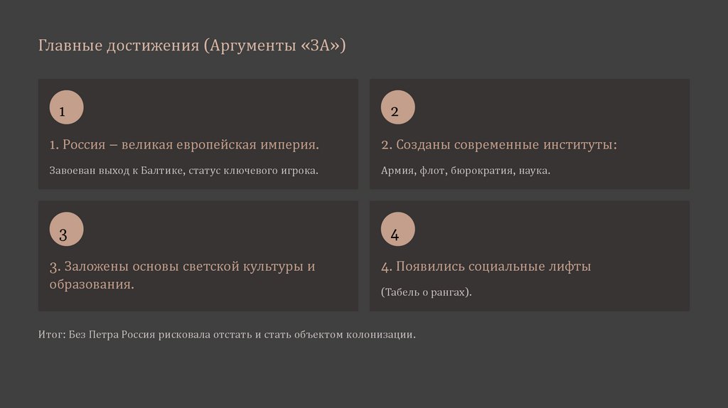 Итог: Без Петра Россия рисковала отстать и стать объектом колонизации.