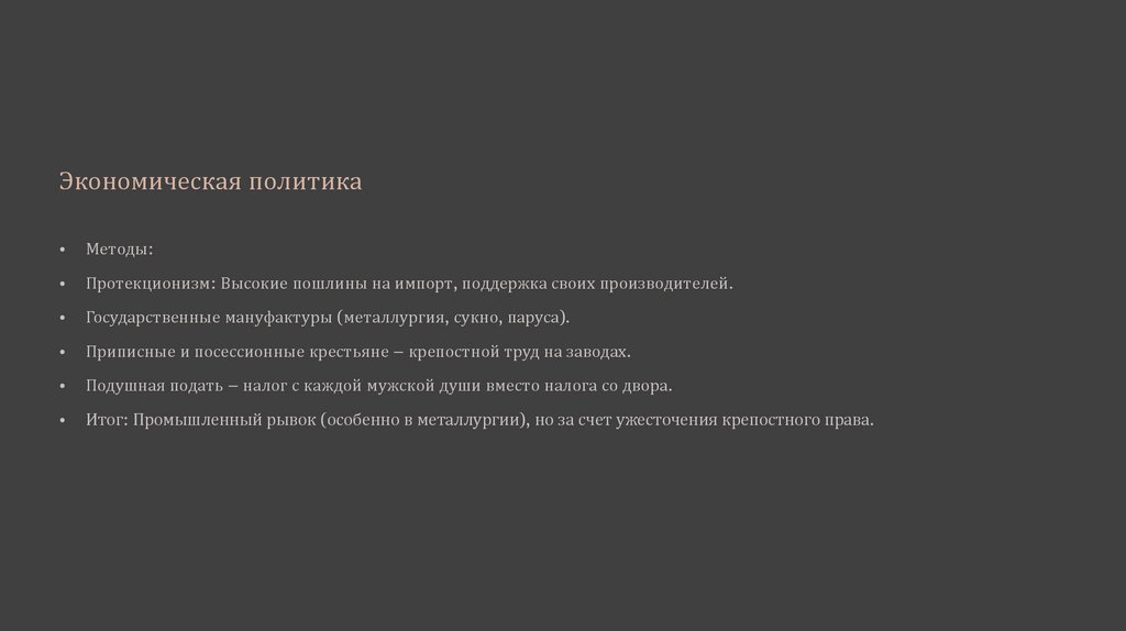 Итог: Промышленный рывок (особенно в металлургии), но за счет ужесточения крепостного права.