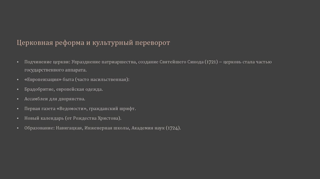 Церковная реформа и культурный переворотПодчинение церкви: Упразднение патриаршества, создание Святейшего Синода (1721) – церковь стала частью