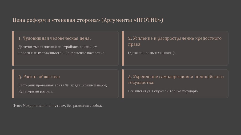 С другой стороны: Закрепление модели развития, основанной на принуждении, гиперцентрализации и крепостничестве.