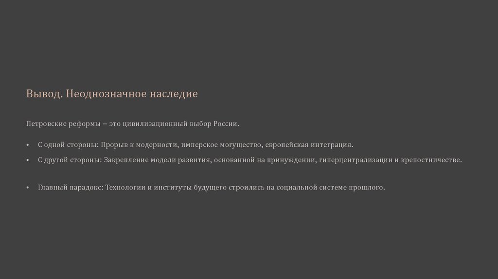 Вывод. Неоднозначное наследиеПетровские реформы – это цивилизационный выбор России.