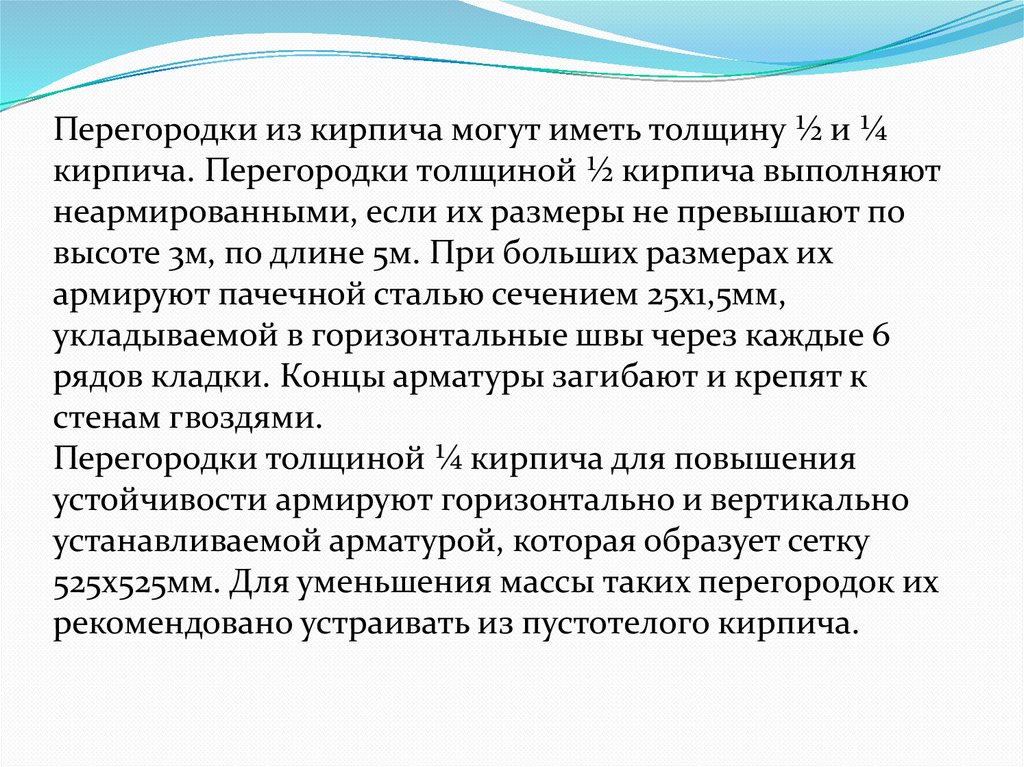 Перегородки из кирпича могут иметь толщину ½ и ¼кирпича. Перегородки толщиной ½ кирпича выполняют