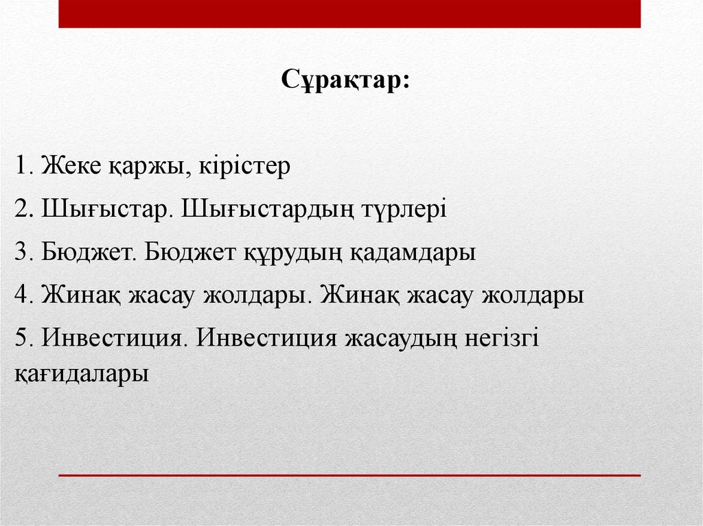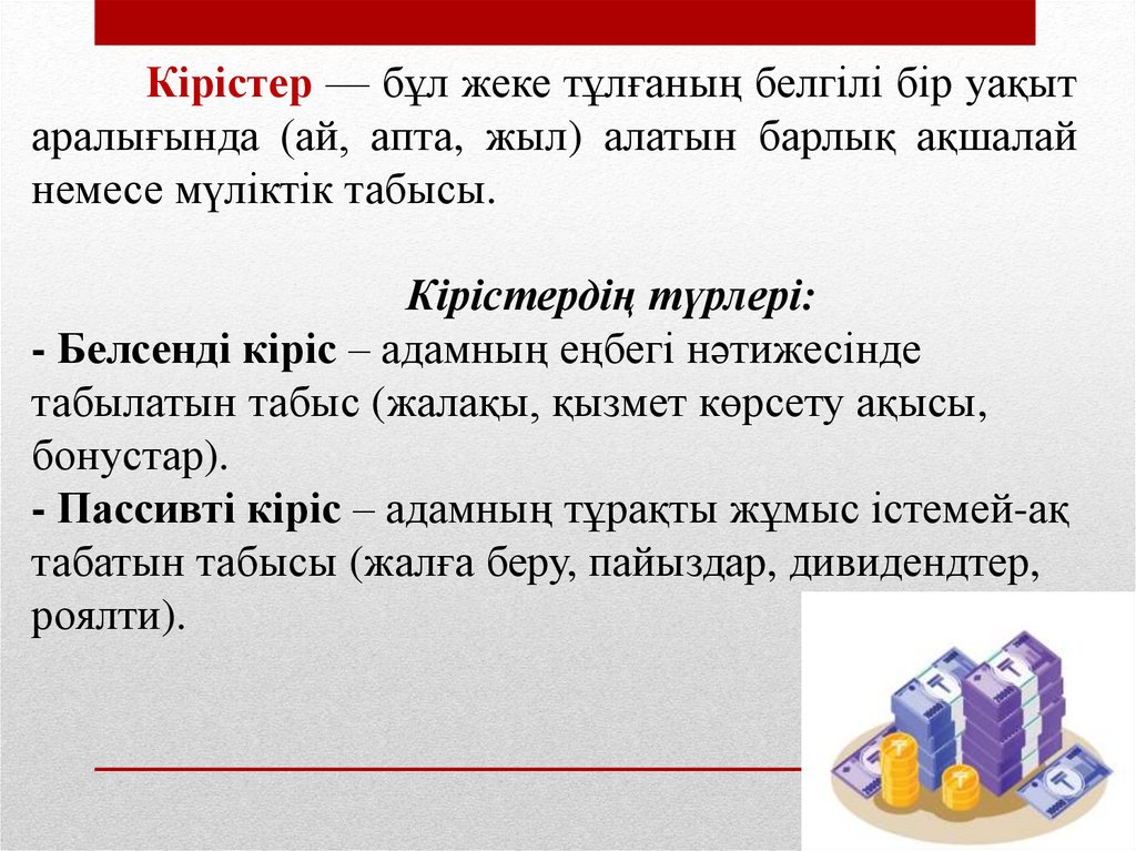 1. Кірістер – жалақы, жәрдемақы, сыйақы, инвестициядан түскен