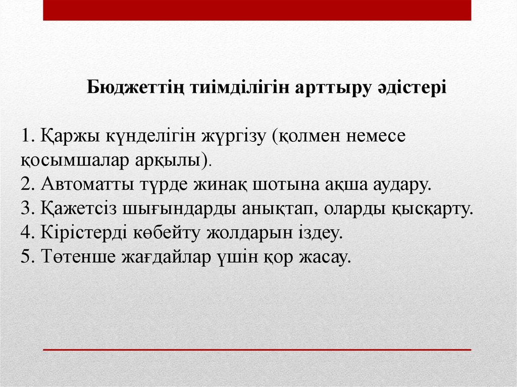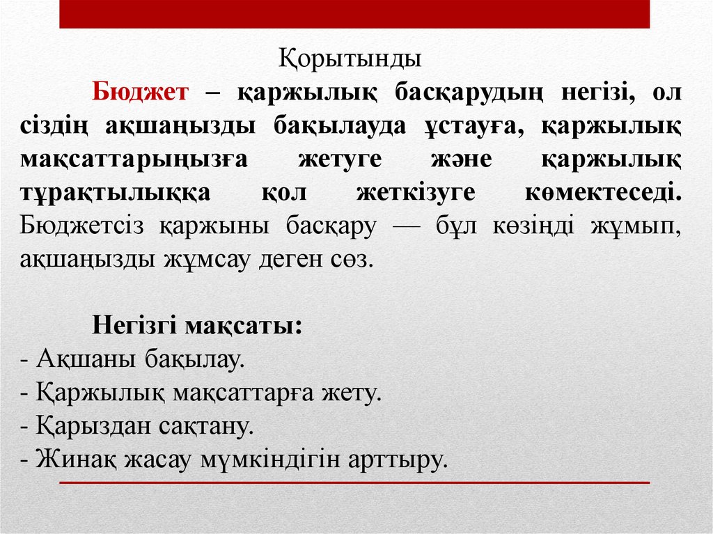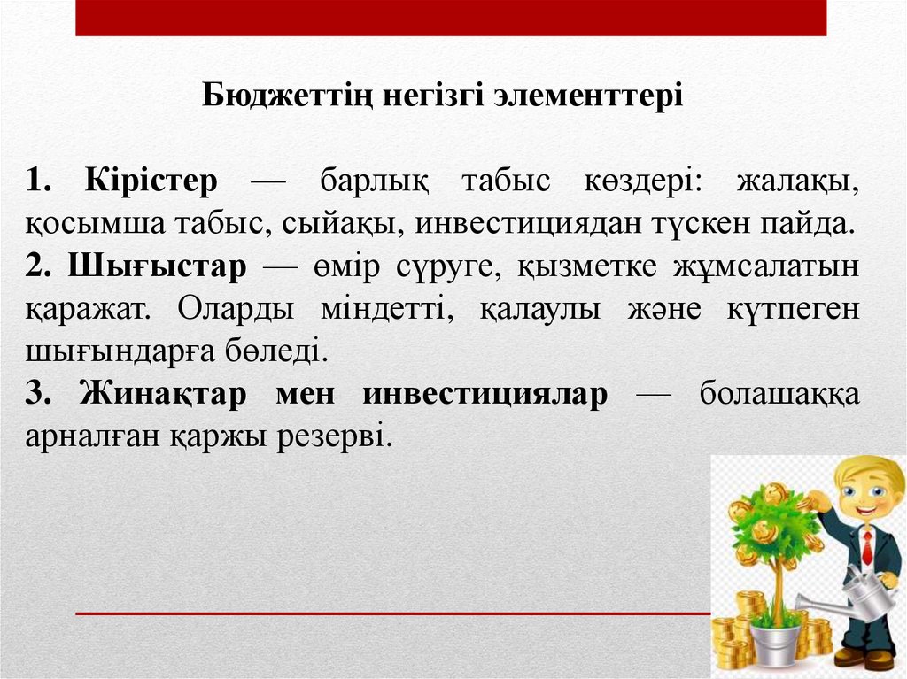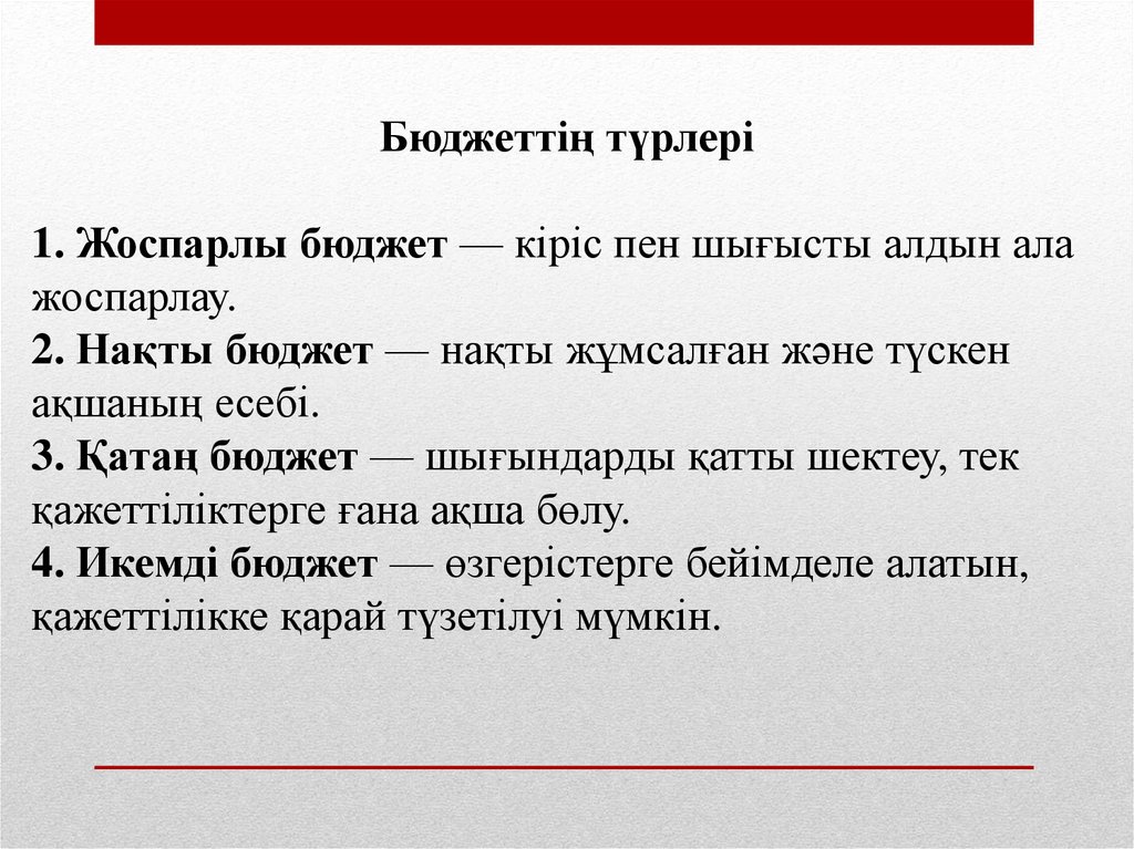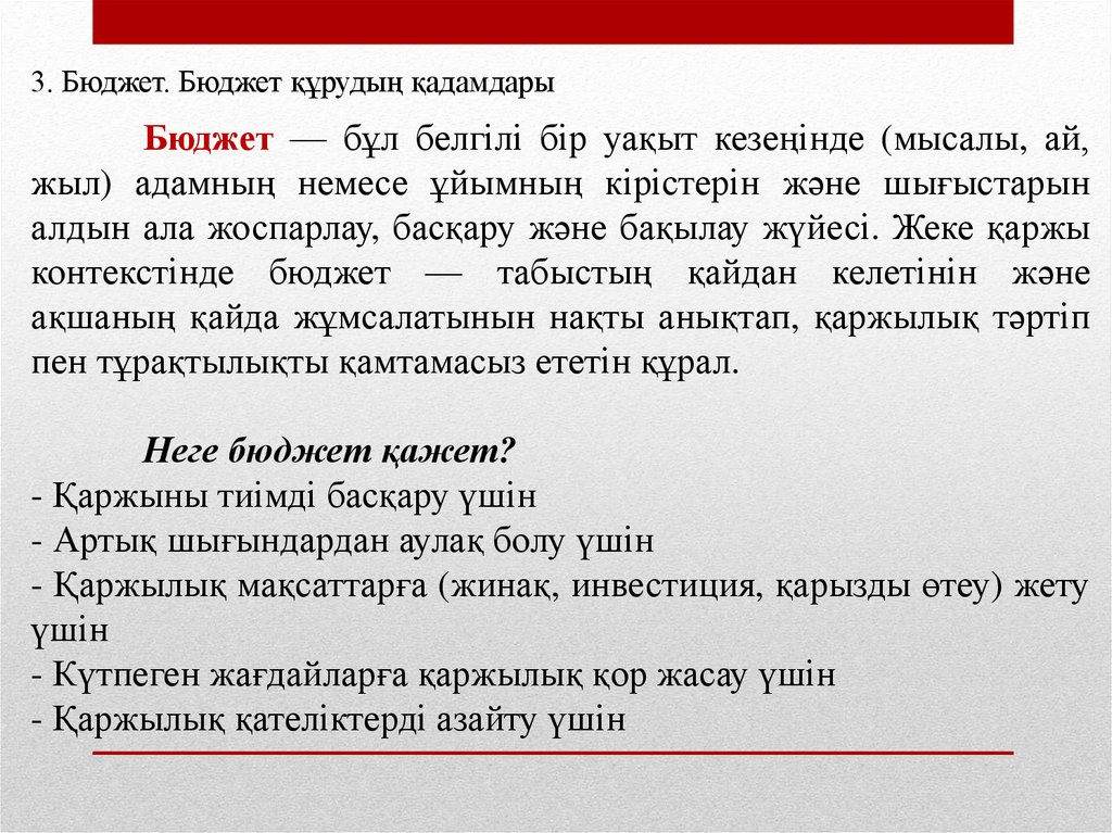 3. Бюджет – кірістер мен шығыстардың жоспары. Бұл қаржыны