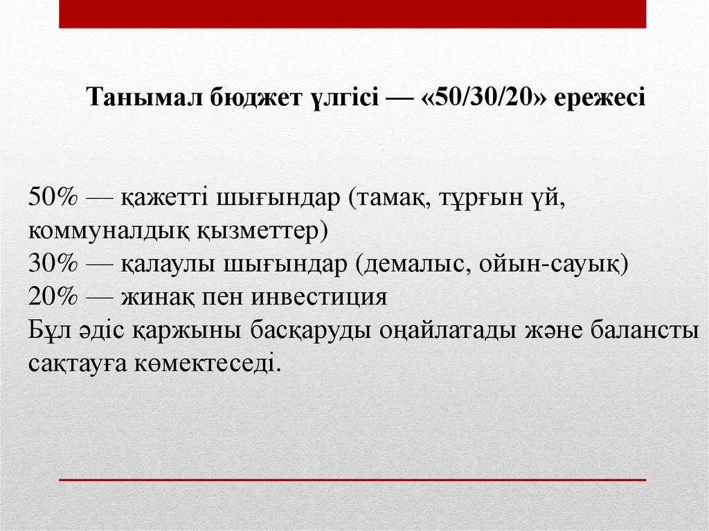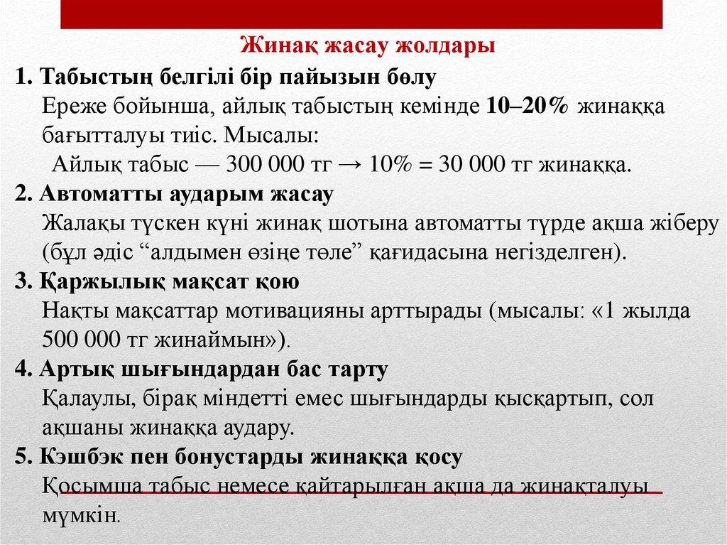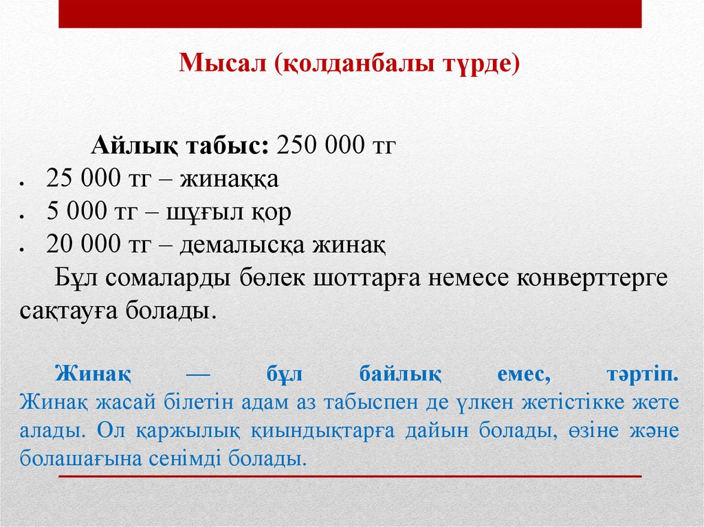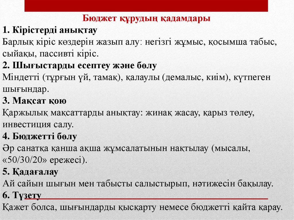 Мысалы: ай сайынғы бюджетті құру, жинаққа қанша ақша