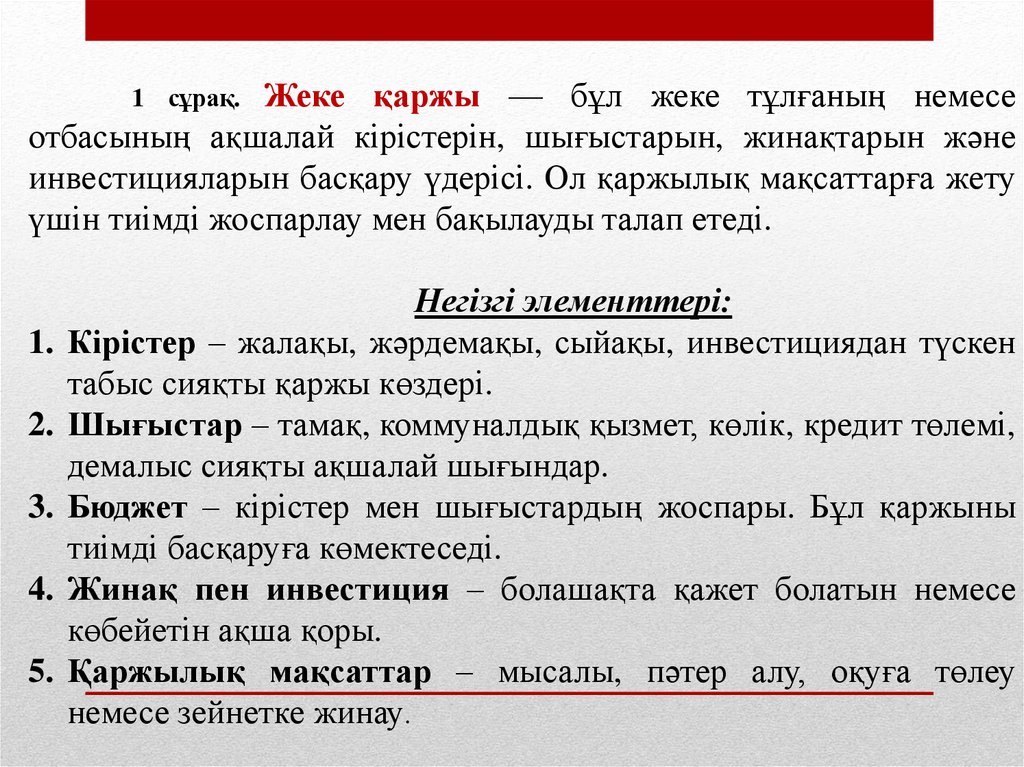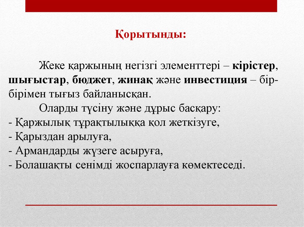 Қорытынды:Жеке қаржының негізгі элементтері – кірістер,