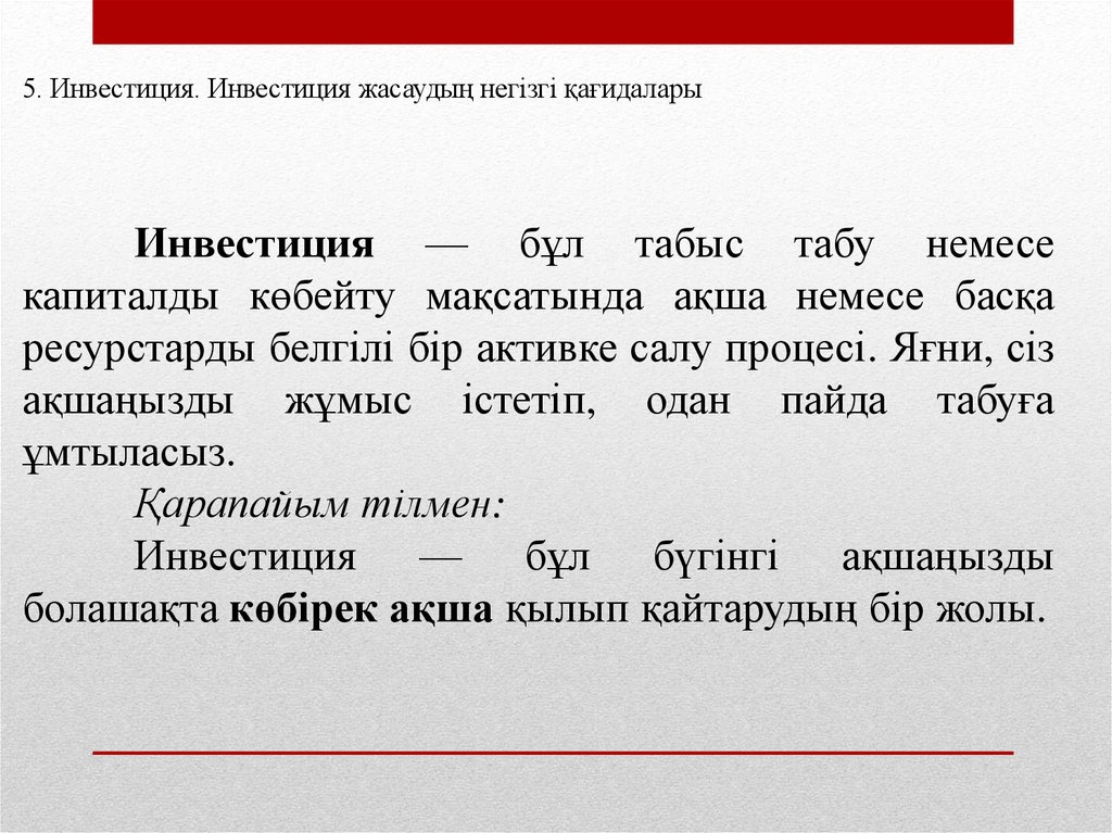 5. Инвестиция. Инвестиция жасаудың негізгі