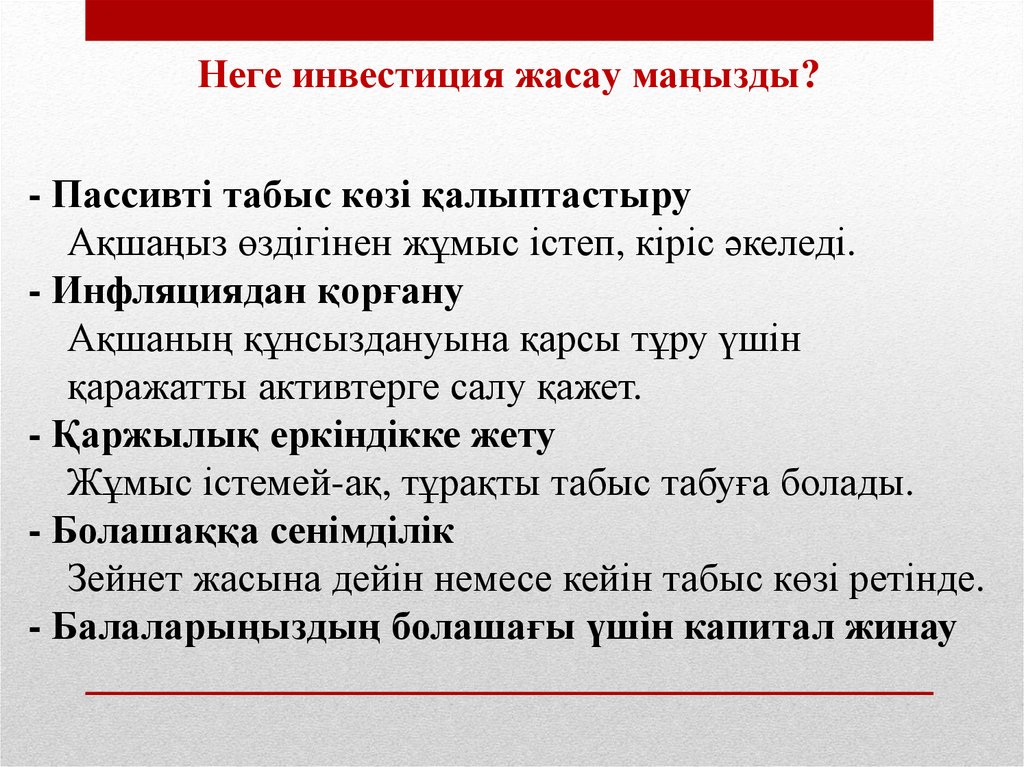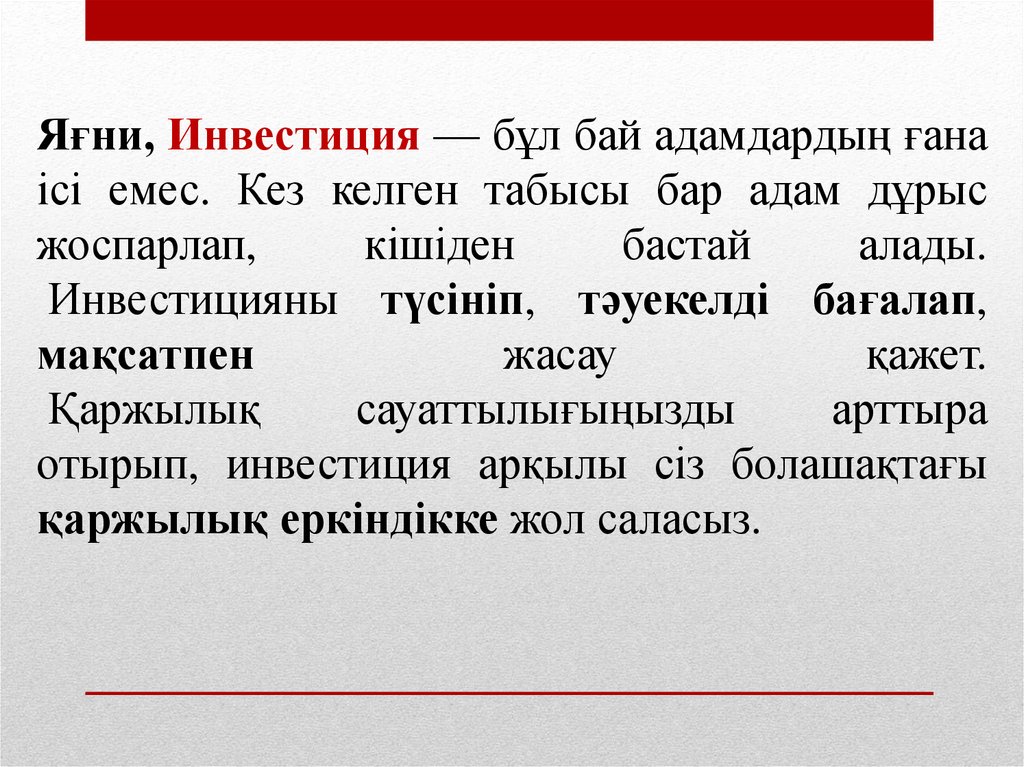 Яғни, Инвестиция — бұл бай адамдардың ғанаісі емес. Кез келген табысы бар адам дұрыс