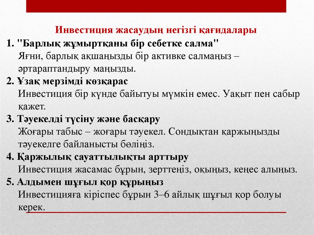 Инвестиция жасаудың негізгі қағидалары1. "Барлық жұмыртқаны бір себетке салма"