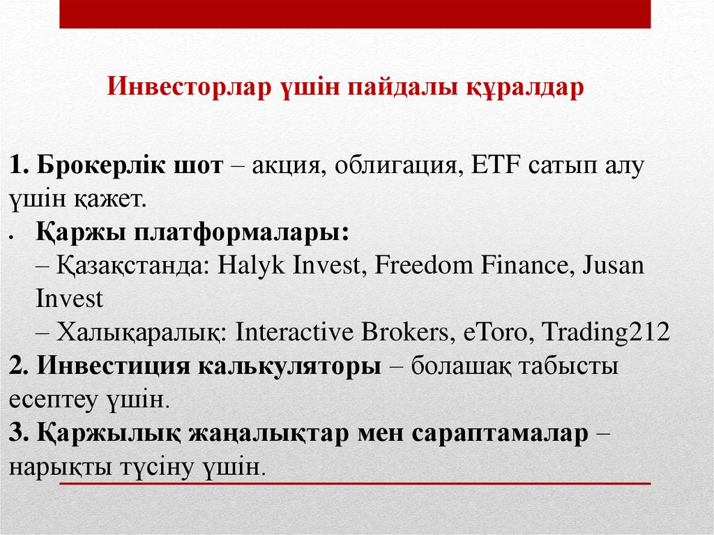 Инвесторлар үшін пайдалы құралдар1. Брокерлік шот – акция, облигация, ETF сатып алу